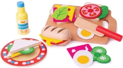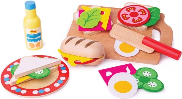 Le coffret contient tout le nécessaire pour préparer un délicieux sandwich : une baguette, des tranches de pain, de la mayonnaise, de la salade, du concombre, du fromage, un œuf et une tomate, complétés par une assiette, une planche et un couteau. Les matériaux proviennent de sources responsables et le jouet répond aux normes de sécurité européennes, pour une utilisation en toute confiance.