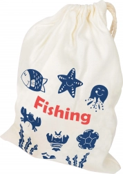 Pendant le jeu, les enfants attrapent différentes créatures marines colorées à l’aide de deux cannes magnétiques. Le jeu est accompagné d’un dé coloré qui indique quel animal doit être pêché. Le tout est rangé dans une pratique pochette en tissu, idéale pour voyager.