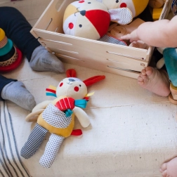 Le jouet est fabriqué en coton biologique certifié et avec des colorants non toxiques, doux pour la peau et respectueux de l’environnement.