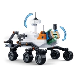 Modèle à multiples roues avec bras robotique fonctionnel pour simuler une véritable exploration spatiale.