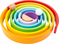 Ce grand arc-en-ciel en bois offre des dizaines de façons de jouer : construction de tours et de ponts, création de pistes à billes ou défis d’équilibre. Les enfants apprennent naturellement les couleurs, les tailles et le tri, entraînent la coordination œil–main et développent la pensée logique.