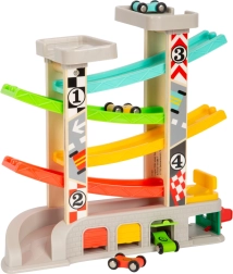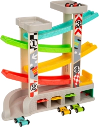 La piste est conçue pour développer le jeu d’imitation et la motricité fine, tandis que les enfants font courir quatre petites voitures de couleurs différentes. De plus, grâce au système pratique de stationnement et de rangement, les petits pilotes peuvent facilement remettre leurs voitures en place après la course.
