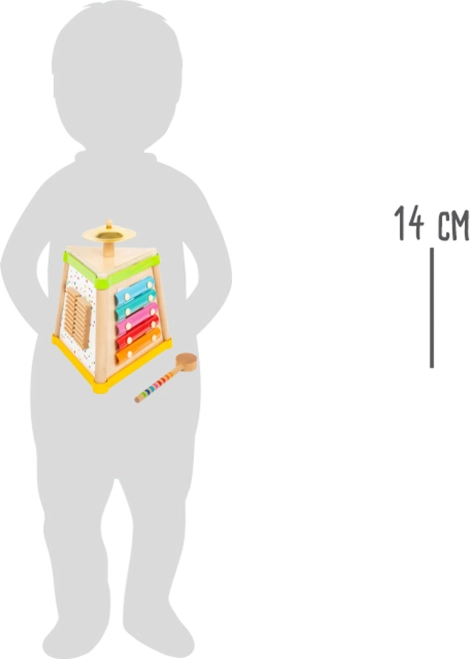 - Comprend 4 instruments sonores différents: hochet, mini-xylophone, petit tambour et petite cymbale.