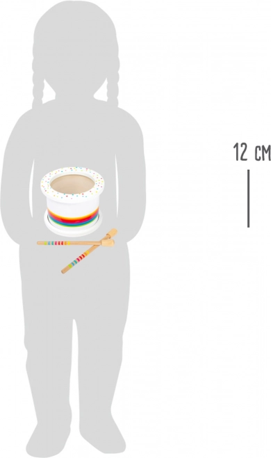 Le tambour en bois présente une finition blanche avec des rayures arc-en-ciel et des pois colorés.