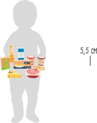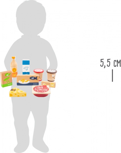 L’ensemble comprend du jus d’orange, deux pots de glace, un paquet de petits pois, des bâtonnets de poisson, du beurre, du fromage, du saucisson tranché et une brique de lait. Les impressions réalistes et l’apparence naturelle séduisent au premier regard. Grâce au bois robuste, l’ensemble est durable et prêt pour un usage quotidien.