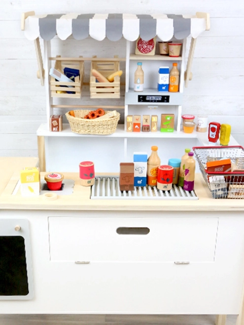 Idéal comme complément d’une cuisine pour enfants, d’une boutique ou d’un stand. Les enfants peuvent « faire les courses », trier et ranger les aliments, développer leur vocabulaire et apprendre les bases d’une alimentation saine. Des matériaux sûrs et une finition lisse garantissent une utilisation confortable et sécurisée.