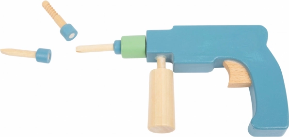 Comprend une équerre avec niveau à bulle, une clé, un tournevis, un marteau, une pince et une perceuse avec 3 embouts.