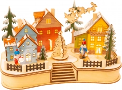 Ce village de Noël en bois, soigneusement travaillé, apporte une lumière douce et une touche de féerie à tout intérieur. Grâce au rétroéclairage indirect, les découpes détaillées des maisons, des sapins et des scènes hivernales ressortent magnifiquement. Une fois allumée, la rotation du sapin au centre du village confère un effet vivant et festif à l’ensemble.