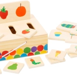 Découvrez une boîte de tri en bois ingénieuse inspirée de l’histoire de la Très Affamée Chenille, qui aide les enfants à reconnaître les formes et les couleurs, à entraîner la pensée logique et la motricité fine. Boîte pratique avec couvercle et 19 pièces, idéale aussi en voyage – la bande élastique et le bouton en bois gardent tout bien en place.