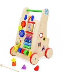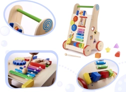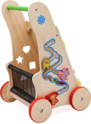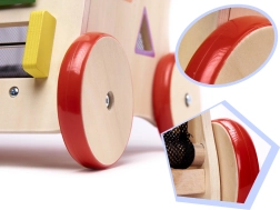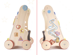 Toutes les pièces du chariot sont soigneusement poncées pour protéger les petites mains des échardes, et peintes avec des peintures non toxiques et écologiques. La structure est stable, avec des roues en bois gainées de caoutchouc pour plus de sécurité. Le chariot possède également sur les côtés un tri de formes avec quatre blocs colorés et un labyrinthe avec de jolis animaux.