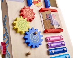 Sur la face avant se trouve une planche remplie d’éléments interactifs pour stimuler les sens de l’enfant, dont une horloge, des engrenages et des cymbalettes.