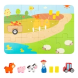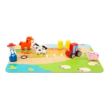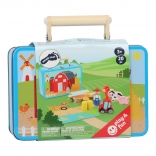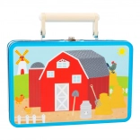 Le petit cochon grogne, le tracteur bourdonne. Un jeu portable dans une jolie petite valise : les enfants peuvent créer leur propre ferme grâce aux figurines en bois en forme de tracteur, d’animaux domestiques et d’agriculteur. D’abord, assemblez la base avec le puzzle, puis vous pouvez commencer à jouer ! Les bottes de foin figurines complètent la ferme à la perfection. Plongez dans la vie à la campagne et laissez libre cours à votre imagination. La valise est fabriquée en métal robuste, la poignée est en bois et la serrure s’ouvre facilement. Idéal pour les chambres d’enfants, les salles de jeux... Principales caractéristiques : comprend 12 pièces de puzzle et un fermier, un tracteur, un petit cochon, une vache, un cheval et des bottes de foin; emballage pratique – valise métallique avec poignée en bois
