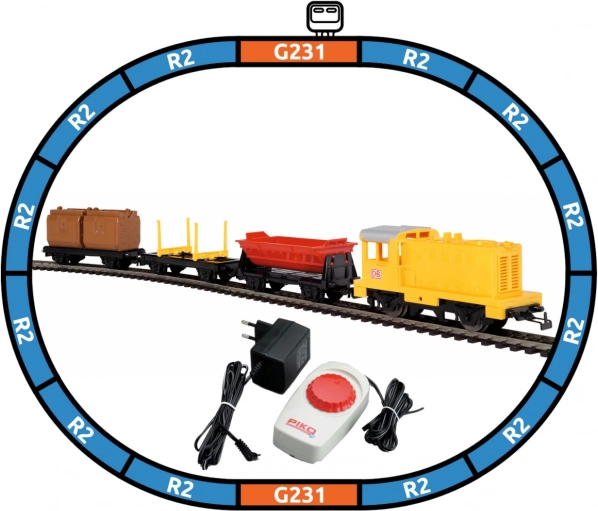 - Locomotive diesel DB (1×), wagons de marchandises DB (3×), courbes R2 55212 (12×), rails droits G231 55201 (2×), éclisse d’alimentation 55270 (1×), contrôleur analogique avec alimentation 55003 (1×)
