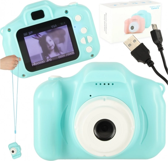 - appareil photo (menthe), câble USB, cordon tour de cou, notice (PL)