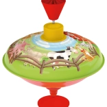 Toupie colorée au motif de ferme qui deviendra le jouet préféré de vos enfants. Il suffit de tirer puis d’appuyer sur la poignée pour que la toupie se mette à tourner et émette son son caractéristique.