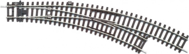 Aiguillage ferroviaire Piko détaillé avec reproduction des traverses en bois dans des couleurs fidèles et une combinaison de deux courbes de 30° (R4/R3) pour l'orientation vers la droite. Commande manuelle avec possibilité de raccordement à un commutateur télécommandé.