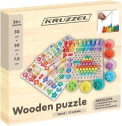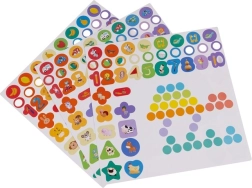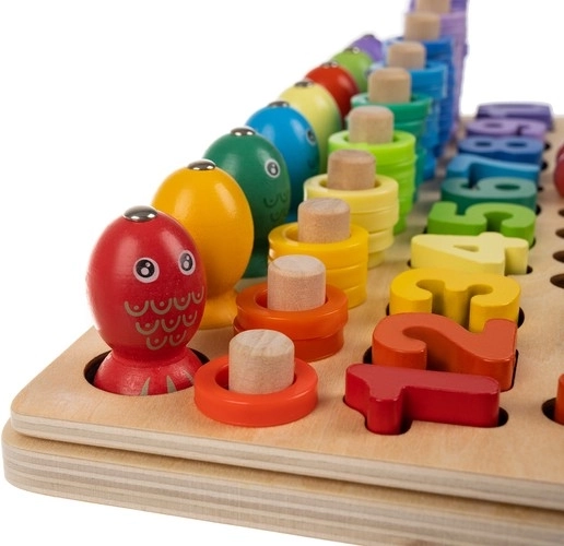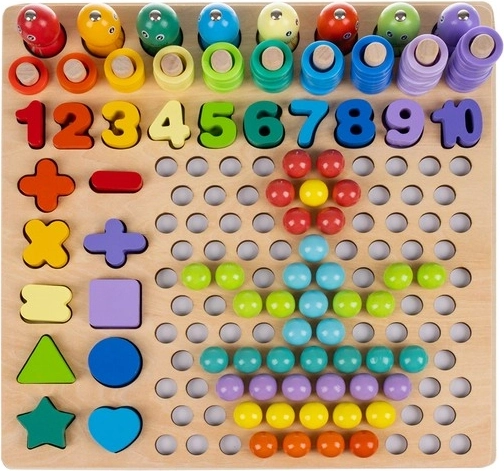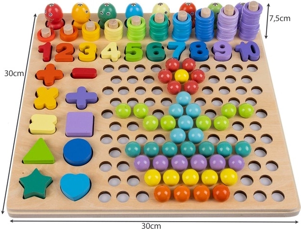 Le set comprend des modèles recto-verso, des chiffres, des symboles mathématiques, ainsi que des anneaux et des billes colorés pour construire des motifs. Grâce à sa base en bois, le jouet est résistant et stable, ses couleurs vives stimulent la créativité et l’enfant acquiert facilement les bases des mathématiques.