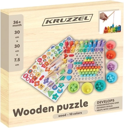 Ce coffret éducatif en bois complet combine mosaïque avec perles, assemblage de formes et pêche magnétique. Les enfants s’exercent de manière ludique aux nombres, au tri des couleurs et à la reconnaissance des formes, tout en développant la motricité fine et la préhension grâce à la pince, aux baguettes et à la cuillère. Convient au jeu autonome comme à l’apprentissage partagé avec les parents.
