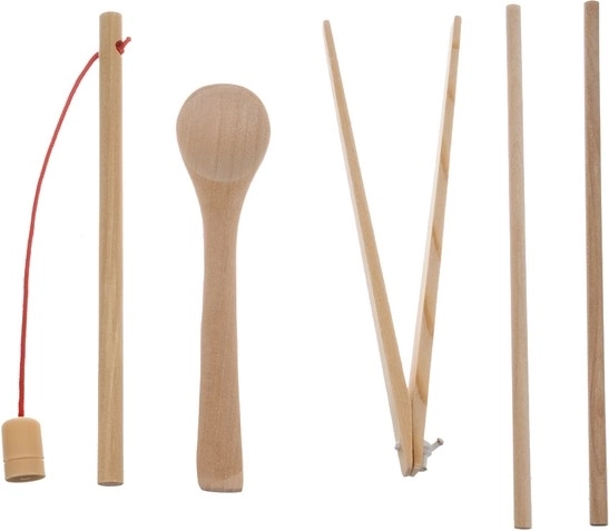 - base en bois, 3 planches recto verso, accessoire en bois, 7 moules, pince, canne à pêche, cuillère, baguettes, 8 poissons magnétiques, 5 signes mathématiques, 10 chiffres, 5 formes, 55 anneaux, 77 billes