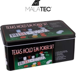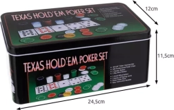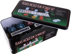 Set complet de poker TEXAS HOLD’EM dans une boîte métallique pratique, comprenant 200 jetons de différentes valeurs, 2 jeux de cartes, un ensemble de jetons de fonction (Dealer, Small Blind, Big Blind) et un tapis de jeu vert. Le tout est rangé de façon claire dans un support à jetons, garantissant l’ordre et un transport facile.