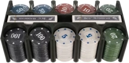 Le support pratique maintient jetons et cartes en place. Manipulation facile pour les joueurs et le « croupier », avec de l’ordre pendant toute la partie.
