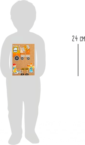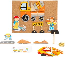 La planche en liège avec punaises permet d’assembler et de réorganiser à l’infini des scènes de transport et de chantier selon l’imagination des enfants.
