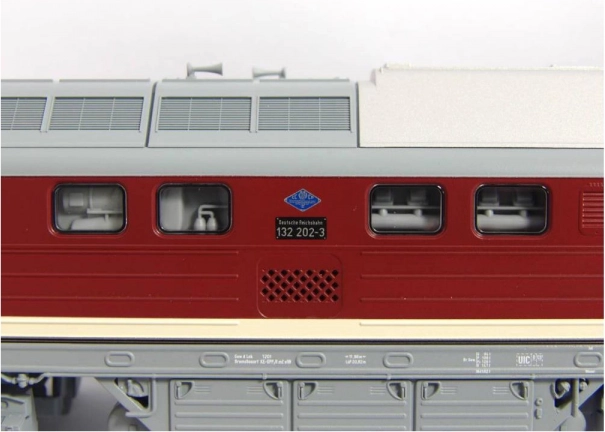 Modèle fidèle et détaillé de la locomotive diesel-électrique BR 132 « Ludmilla » en livrée DR. Il séduit notamment par des détails différenciant des autres variantes, tels que la rambarde sur la face avant, les détails des fenêtres frontales et latérales ainsi que la conception du toit. La peinture et les marquages, incluant tous les éléments décoratifs, sont de la plus haute qualité, conformes à la gamme Expert. Le modèle est équipé d’un moteur puissant doté de volants d’inertie ; le couple est transmis par des roues bandagées disposées en diagonale sur les essieux internes des bogies, tandis que quatre essieux sont moteurs. Associé à un long châssis en zinc moulé, cela garantit d’excellentes qualités de roulement. L’éclairage LED blanc/rouge change selon le sens de marche et la cabine de conduite est également éclairée. Le modèle peut être équipé d’un décodeur numérique spécifique avec module sonore et haut-parleur. Des voitures de type et de finition correspondants sont également disponibles. Caractéristiques principales : six essieux moteur avec deux volants d’inertie deux roues motrices bandagées éclairage avec inversion blanc/rouge selon le sens de marche éclairage intérieur interface PluX22 selon NEM 658 boîtier NEM 362 avec cinématique d’attelage court Documentation : Brochure des modèles BR 132/BR 232 (DE) Informations générales sur la BR 130 (DE, EN, F, NL) Essai du modèle dans le magazine Miniaturbahnen 2/2018 (DE) Notice d’utilisation et liste des pièces détachées du modèle n° 52760 (DE, EN, F, NL)