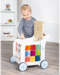 La marchette combine plusieurs activités comme un labyrinthe, un puzzle et un tableau à dessin, qui favorisent les compétences des enfants.
