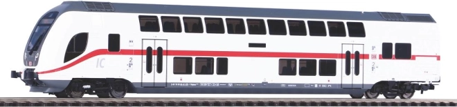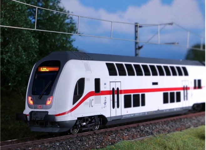 Voiture-pilote à deux niveaux de 2e classe pour l’échelle H0, soigneusement réalisée, avec livrée et marquages DB AG. Elle offre un éclairage LED blanc/rouge avec inversion selon le sens de marche, est préparée pour un décodeur de commande et est idéale pour rames IC2 complètes avec locomotives BR 146.5 ou 147.5.