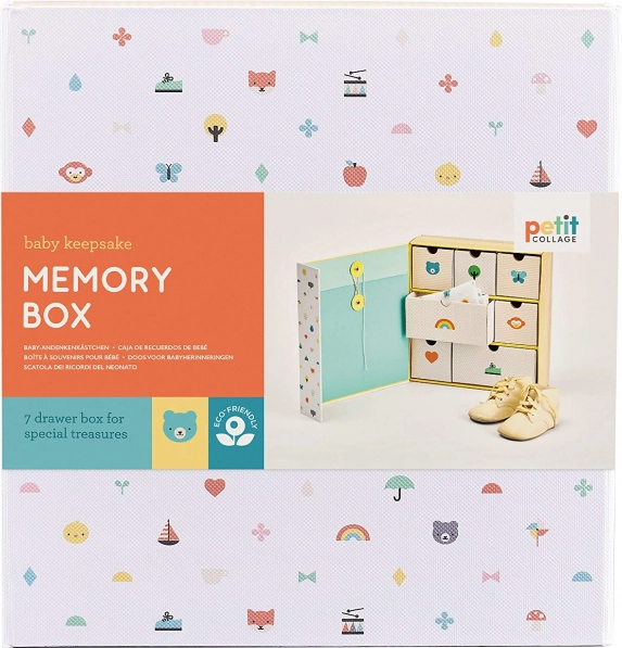 Élégante et bien pensée, cette boîte à souvenirs aide à organiser tous les moments les plus précieux des premiers mois et années de l’enfant. Grâce aux multiples tiroirs et à la poche, vous triez facilement les petites choses et vous y reviendrez avec joie à tout moment. Son design minimaliste et ludique avec illustrations fait de la boîte un bel accessoire pour la chambre d’enfant.