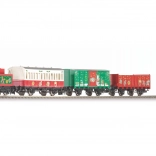 Locomotive à vapeur 0-4-0 avec tender, voiture voyageurs et deux wagons de fret dans un design festif harmonisé. Parfait pour créer instantanément l’atmosphère.