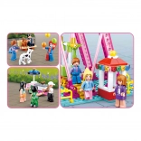 La pièce maîtresse du set est une grande roue rose et bleue avec rotation fonctionnelle et plusieurs cabines. Les enfants peuvent facilement faire tourner l’attraction et créer l’ambiance réaliste d’une fête foraine.