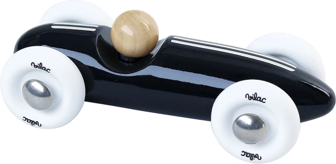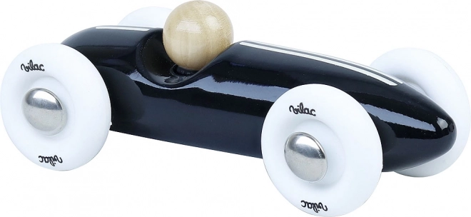 Lignes épurées, contraste entre la carrosserie noire et les roues blanches, et une icône pilote en forme de boule font de cette petite voiture un bel objet décoratif.