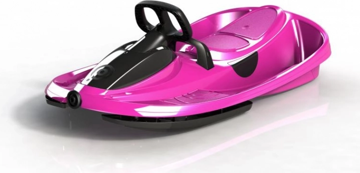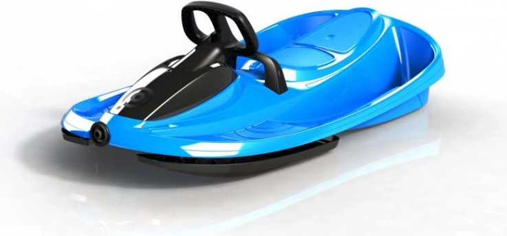 Luge STRATOS avec volant – conception unique et robuste ; la direction par différentiel augmente la vitesse dans les virages, car chaque patin peut s’orienter sous un angle différent ; mécanisme automatique d’enroulement de la corde de traction ; deux sièges ; capacité de charge 90 kg ; frein massif avec ressort de rappel à la position initiale ; aucun élément métallique, pas de risque de corrosion ; certification de sécurité pour les enfants.