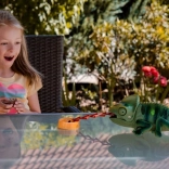 Le jouet permet de contrôler les mouvements vers l'avant, vers l'arrière, à gauche et à droite. Le dos du caméléon peut briller en cinq couleurs, et ses yeux, sa queue mobiles et sa langue extensible permettent une interaction de jeu – par exemple, attraper des insectes à partir des disques en plastique fournis. Ce jouet est un excellent choix pour les enfants fascinés par les technologies avec des éléments naturels.