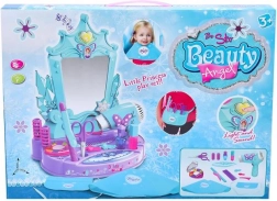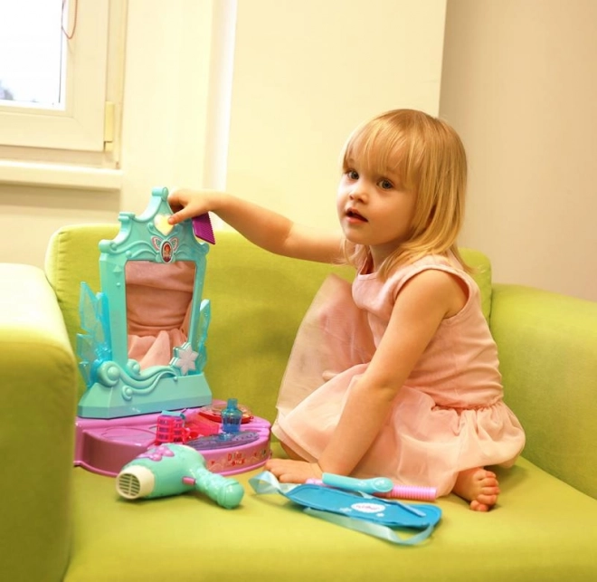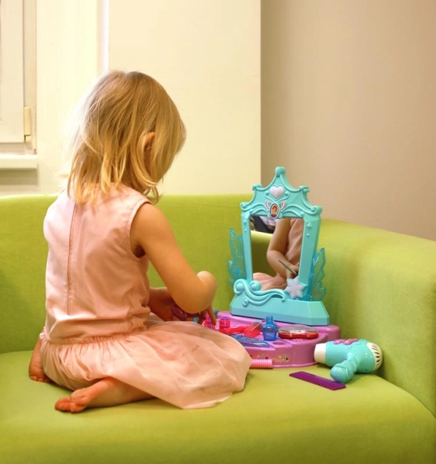 Cet élégant ensemble de coiffeuse, aux couleurs turquoise et violet, offre des heures de jeu créatif. L’élément central est un miroir avec effets lumineux et sonores – une fois activé, il lance des mélodies qui intensifient l’ambiance des jeux de salon de coiffure ou de beauté.