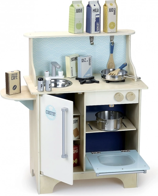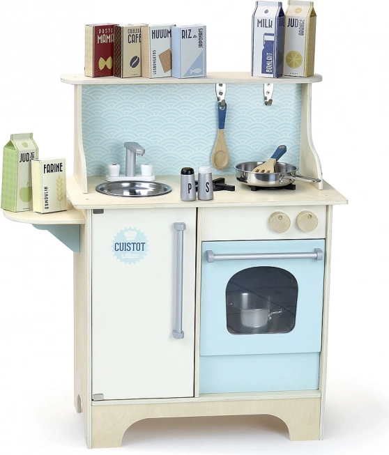 Cette cuisine en bois bleue VILAC Cuistot transforme toute chambre d’enfant en petit studio culinaire. Les enfants adoreront les détails réalistes comme la cuisinière avec cadrans cliquetants, l’évier et le four, et profiteront d’heures de jeu créatif grâce au vaste ensemble d’accessoires.