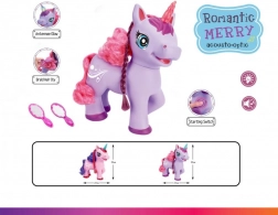 Adorable licorne violette à piles qui ravira les enfants grâce à ses effets – en appuyant sur le bouton sur son ventre, elle commence à chanter une chanson en anglais, émet des sons magiques et sa corne s’illumine. Sont inclus un peigne et un miroir pour coiffer sa longue crinière.