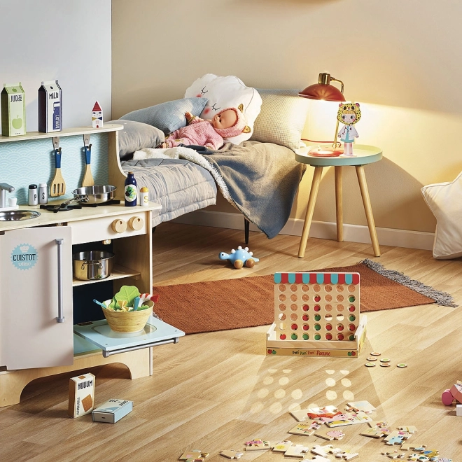 Morpion en bois avec petites pommes rouges et vertes, idéal pour jouer à la maison ou en voyage. Dans ce jeu pour deux joueurs, gagne celui qui forme en premier une ligne de quatre pommes de la même couleur. Convient aux enfants à partir de 5 ans.