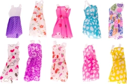 L'ensemble comprend des robes de différentes couleurs et motifs, y compris des pois, des cœurs et des fleurs, idéal pour une créativité créative en habillant les poupées.