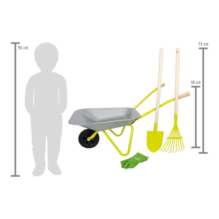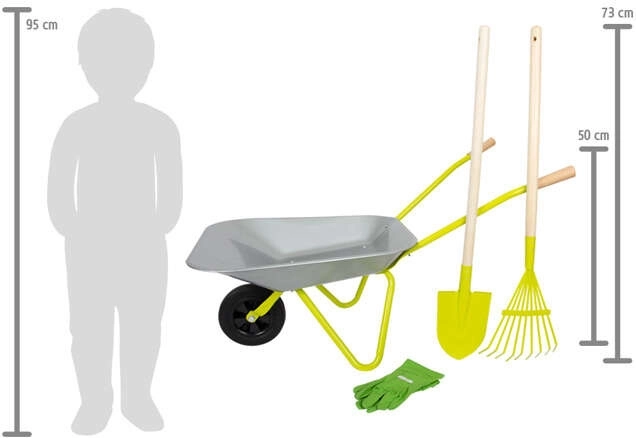 • Dimensions pratiques : brouette env. 79 × 36 × 50 cm, hauteur des poignées 50 cm ; longueur de la pelle et du râteau env. 73 cm.