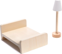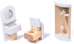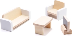 L’emballage contient 16 pièces de mobilier : table, chaises, lit, lampe, fauteuil, canapé, table basse, télévision, piano, banc, transat, parasol, douche, lavabo et toilette.