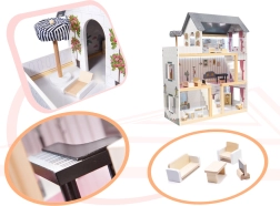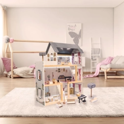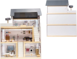 Élégante maison de poupées en MDF de couleur noire, offrant trois étages pleins de divertissement, un riche ensemble de meubles et un éclairage LED d’ambiance. Grâce à sa structure solide en MDF, elle est stable et résistante, tandis que les 16 pièces de mobilier permettent d’aménager avec créativité la cuisine, le salon, la chambre, la salle de bain et la terrasse sur le toit.