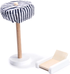 La terrasse sur le toit avec transat et parasol rayé est idéale pour la détente de vos poupées et complète des scènes de vie réalistes.