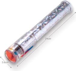 La boîte contient tout le nécessaire pour fabriquer un kaléidoscope fonctionnel d’environ 25 cm de long. Grâce aux charges et décorations interchangeables, les enfants peuvent créer des motifs uniques à partir de perles, de paillettes et de disques colorés. Parfait pour développer la motricité fine, l’imagination et les principes optiques de base.
