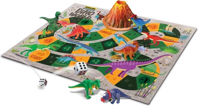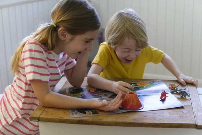 Colorie 6 dinosaures et un volcan, puis tu peux jouer à un jeu d'aventure et déclencher l’éruption du volcan.