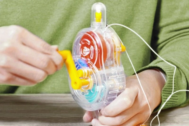 Tournez la manivelle et produisez de l’électricité par vos propres moyens. Le corps transparent montre le travail des engrenages en temps réel.