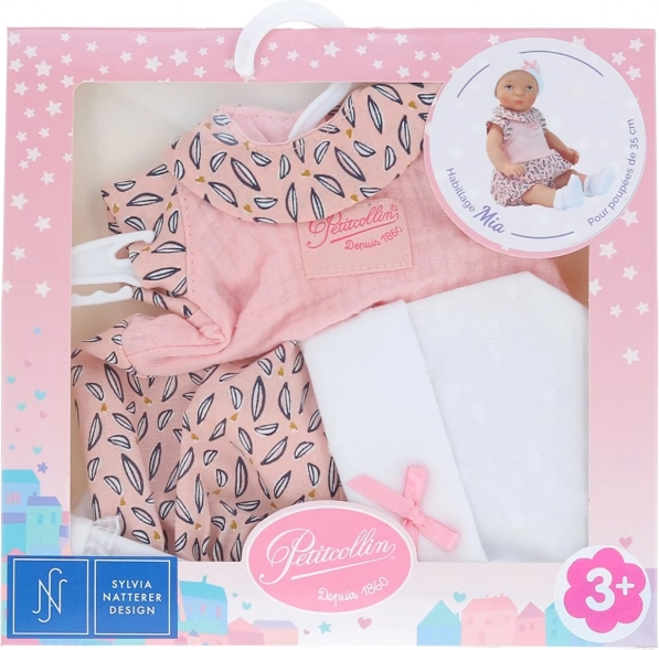 Vêtement Mia pour poupées de Petitcollin apporte l'élégance française et des motifs uniques. Cet ensemble est idéal pour les poupées d'une hauteur de 35 cm et comprend une combinaison, un bonnet et des chaussettes.