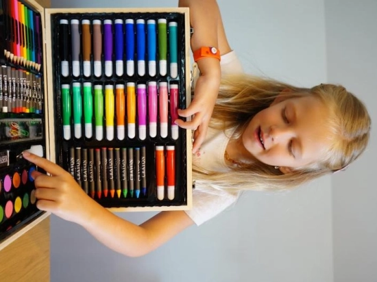 Malette artistique en bois qui ravira tous les peintres et esprits créatifs. La mallette contient 86 pièces : feutres, crayons de couleur, aquarelles, crayons de cire, crayons à papier, règle, gomme...