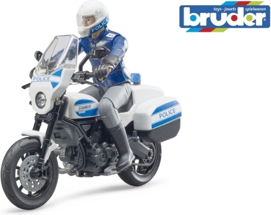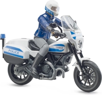 La moto de police DUCATI Scrambler de Bruder est un modèle abouti pour les petits et grands fans des services de secours. La moto dispose d’un guidon orientable pour des manœuvres aisées et d’une béquille repliable pour un stationnement stable. La figurine de policier a des membres articulés, elle peut donc être placée en position de conduite ou à côté de la machine.